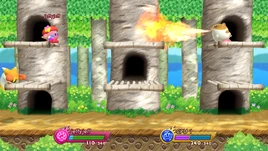 El escenario consiste de 6 plataformas colocadas en los 3 árboles que están presentes. El primer y último árbol tienen 2 puertas, mientras que el central tiene solamente una. Los obstáculos de el lugar son Rick, Kine y Coo, que emergen de las puertas para interrumpir el combate. Coo aparece más seguido que los otros dos y se dispone a atacar son su ataque Cuchillo de Kirby's Dream Land 2. Rick sale un poco menos que Coo y ataca con su ataque Llama, también de Dream Land 2. Kine aparece raramente y solo se dedica a saltar levemente.