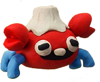 Se parece a un cangrejo rojo con cuatro patas de color azul y con dos pinzas. Tiene una boca negra y una nariz blanca en su cara. También parece tener un tipo de volcán en su cabeza por donde ataca.