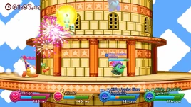Se ve a Kirby pasando casualmente sobre una de las zonas altas de la torre. Entonces, un Poppy Bros. Sr. aparece y lo derriba hacia el borde de la plataforma. Mientras Kirby lucha por regresar a la plataforma, el Poppy Bros. Sr. lanza una bomba a su cabeza y se aleja saltando. La bomba detona segundos después.