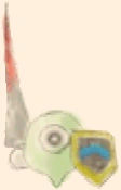 - En su artwork, su escudo parece un escudo de madera de varios colores, pero en sus sprites y render, el escudo es azul.