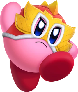 Kirby usa una mascara de luchador profesional de lucha libre. La mascara en sí es principalmente roja, con adornos puntiagudos de color mostaza.