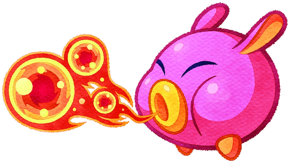 Noserunt Fuego es un enemigo redondo de color rosa, con dos pequeñas patas, dos orejas, dos ojos cerrados y un agujero por el que expulsa fuego.