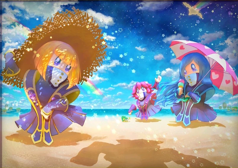 「幸せ」だと伝えて | 星のカービィ スターアライズ | T.F | スタアラ「Prayer song to God」のアレンジかつ「La Follia d'amore」のフレーズあり | ver4.0.0でドリームフレンズの三魔官シスターズ解放後追加。キッスが持っているのはアイアイパラソル、ルージュの足元にいるのはコナー、上空を飛んでいるのはフレンズスター。パルルの視線の先をよく見ると主と思われる影がある。 |