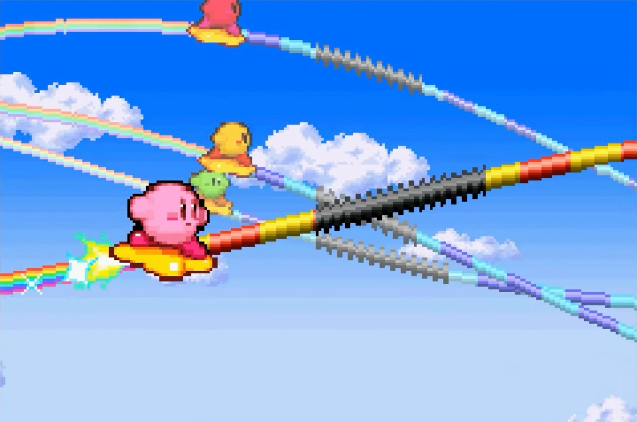 4色のカービィたちが、星[1]に乗り、レール上を走ってレースする。Aボタンを押していることで、レールに乗って加速する。しかし、レール上の黒レールを踏むとタイムロスとなってしまうので、その部分ではAを離す。また、黒レールに入る直前に上手くAを離したり、黒レールを出た直後に上手くAを押すことができると、加速する。ゲーム終了時には、ゴールまでに要したタイムとレールを踏んだレートも表示されるので、それなりの遊び方もできる。