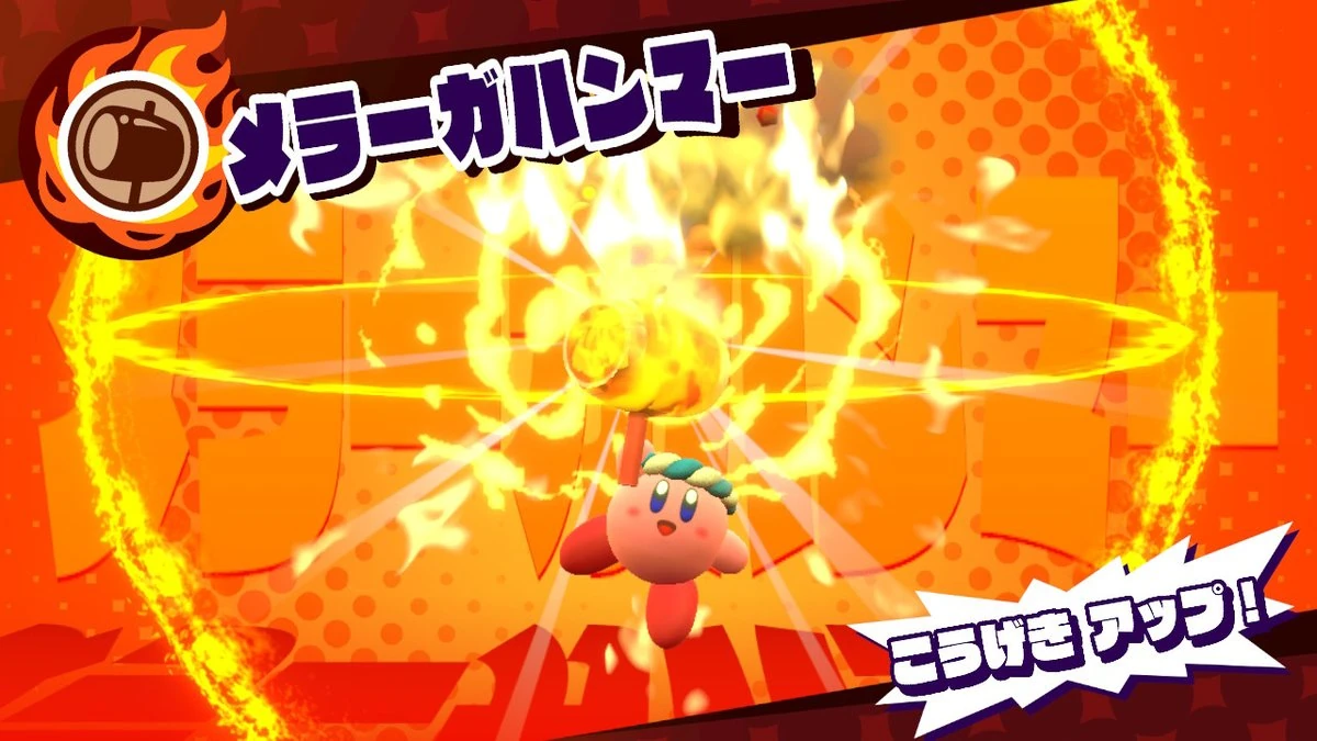 ハンマー能力及びデデデ大王と炎属性の組み合わせ。ハンマーが赤くなり、星のマークが炎のマークに変わる。