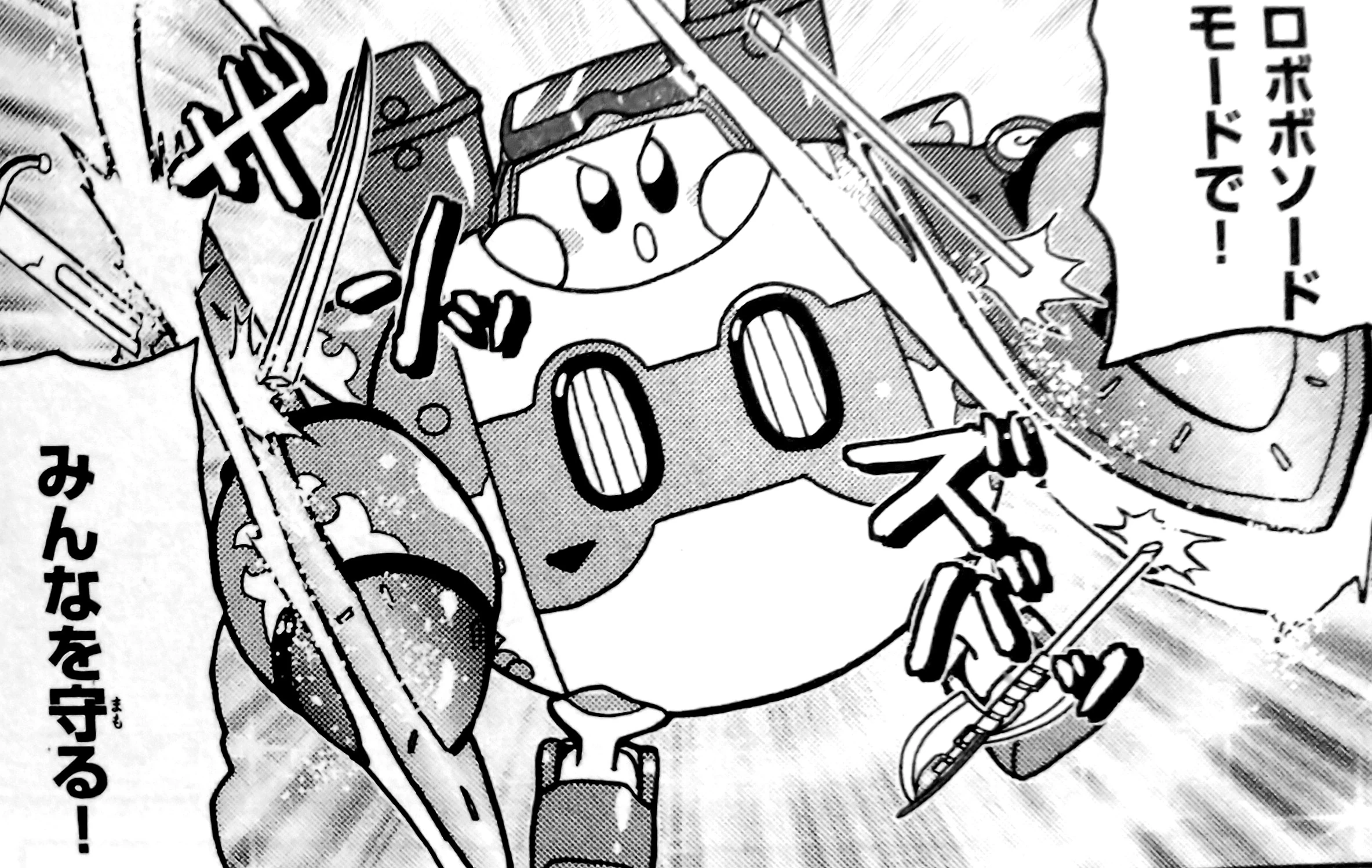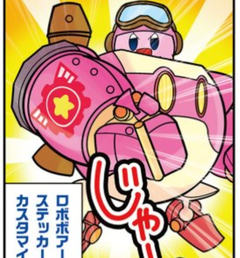 - 入手のためのバトルでは、体力制で赤色のジャイアントメタルカービィ4人と戦う。ステージはカービィシリーズの機械的なステージとして、もしくは『ロボプラ』終盤の展開を意識して戦艦ハルバード。BGMは原作での搭乗時のテーマである「桃球発進! ロボボアーマー」となっている。