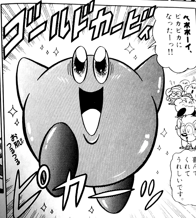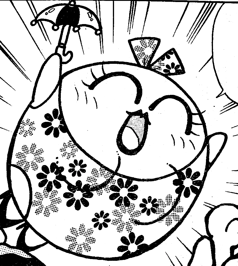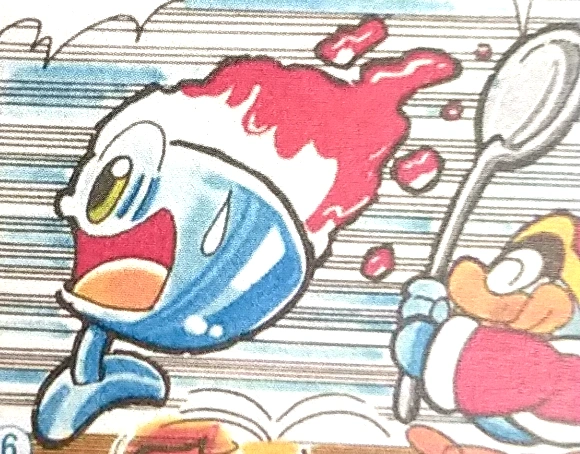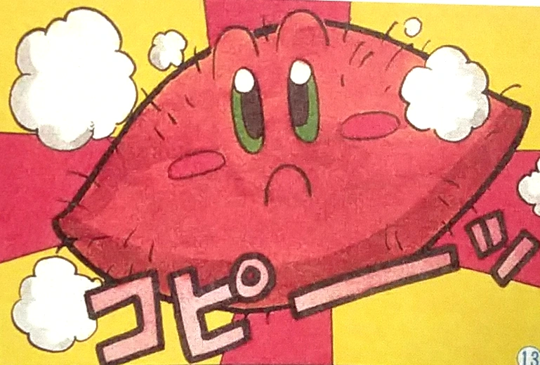 星のカービィ (前田のえみ) 1994年度9月号? | かきごおりをすいこんでコピーした姿。デデデ大王たちに追いかけられたが、跳ねて逃げた。 |