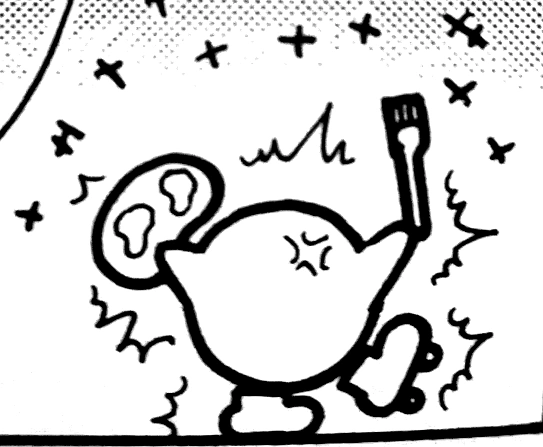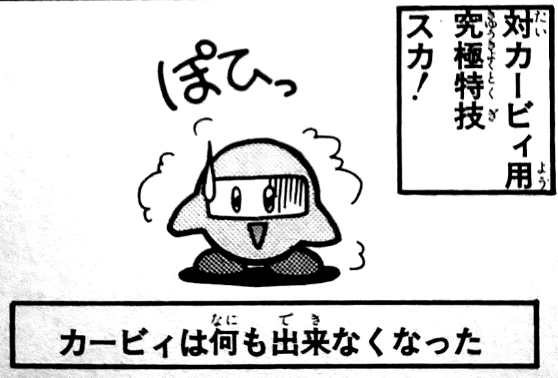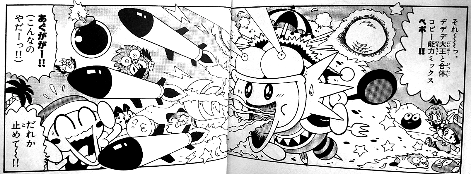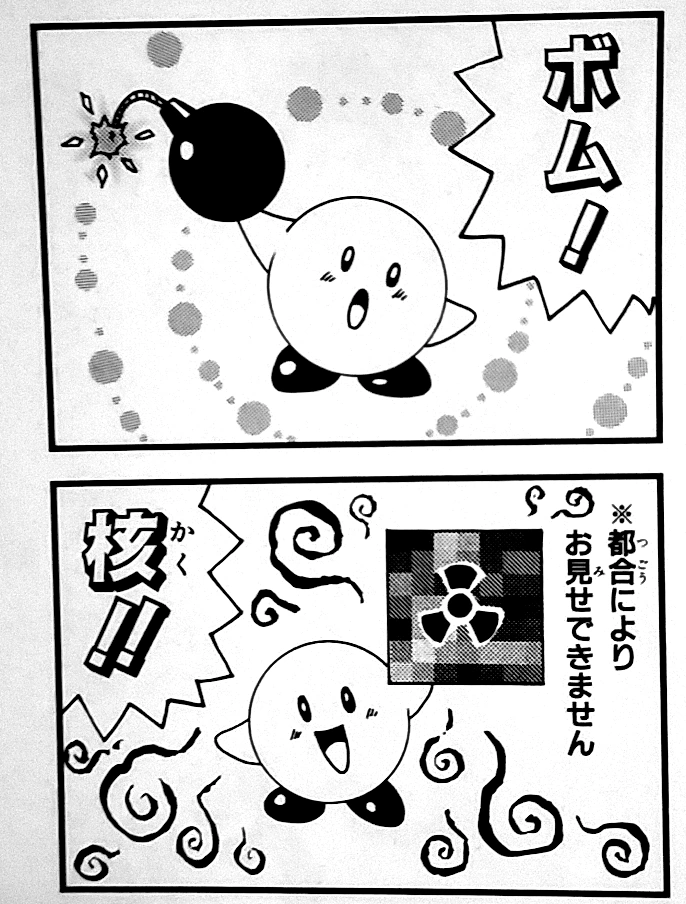 星のカービィ64 4コマギャグバトル カービィ増量中 | 大賀作。カービィが編み出した最強のミックス。ボム+核。デデデ大王とアドレーヌに殴られて未遂に終わった。 |