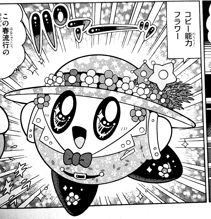 星のカービィ デデデでプププなものがたり ペポポ編 第5話 | アイドル活動としてカービィが発表した新作のコピー能力。実際はただのファッションである。 なお『SDX』の開発段階の新能力のスケッチには「FLOWER」というものがあった(こちらは敵に花を刺す能力)。 |