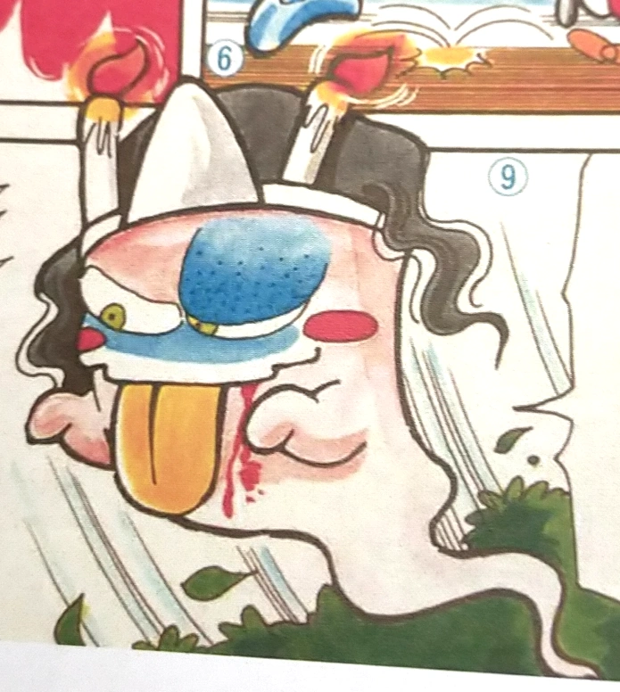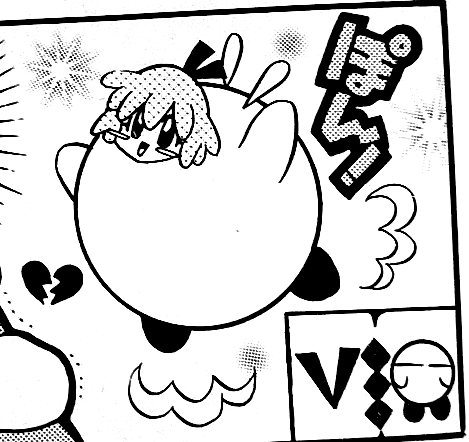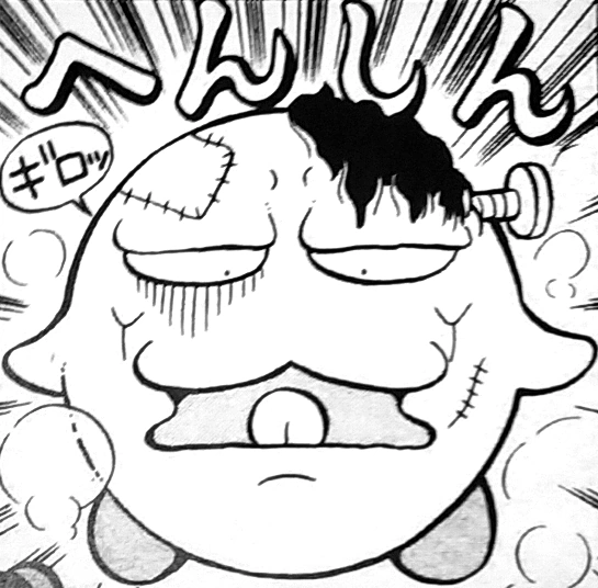 星のカービィ3 4コマギャグバトル まるまるあにまる | 藤井あお作。チャオをすいこんでコピーした姿。能力は「スリット入り」らしい。 |