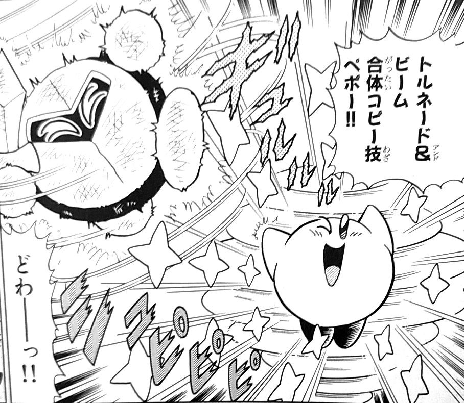 星のカービィ デデデでプププなものがたり 2巻 第5話 | メタナイトの必殺技「真空たつまき回転切り」に憧れたカービィがツイスターとワドルドゥを同時にすいこんでコピー。回転しながらビームを放ち、メタナイトを攻撃した。 |