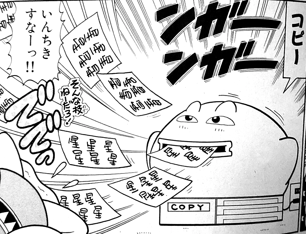 星のカービィ デデデでプププなものがたり 4巻 第6話 | 漢字を何回も書くのを面倒くさがったカービィがプリントを飲み込んでコピーした姿。コピー機のように漢字を書いた紙を複製していんちきした。デデデ大王に「そんな技ねーだろ!」と突っ込まれていた。 性質は大きく異なるが、ゲームでも後に『SDX』で同名の能力が登場。 |