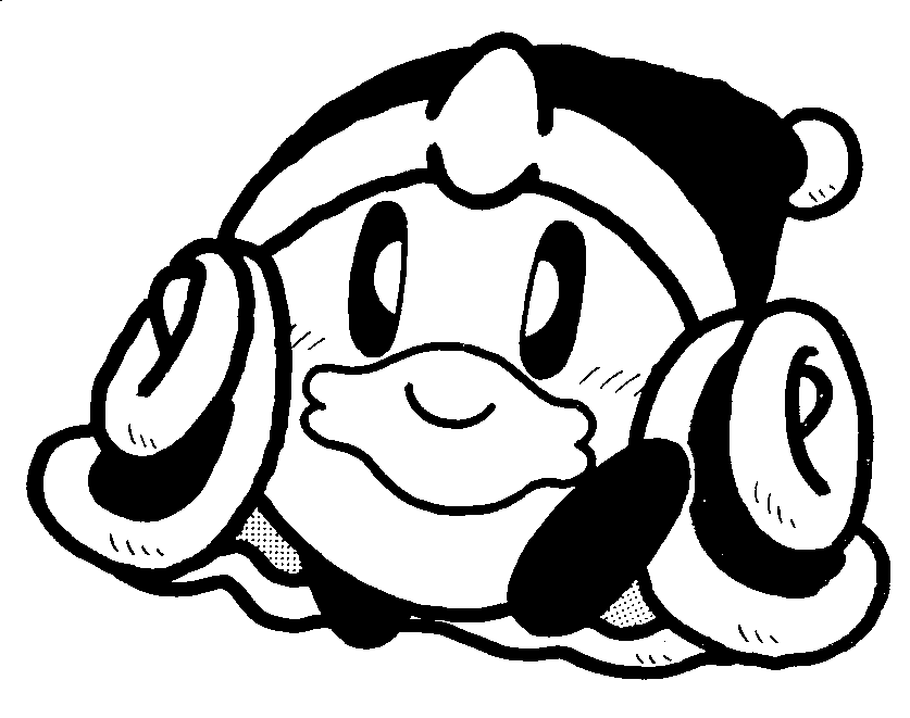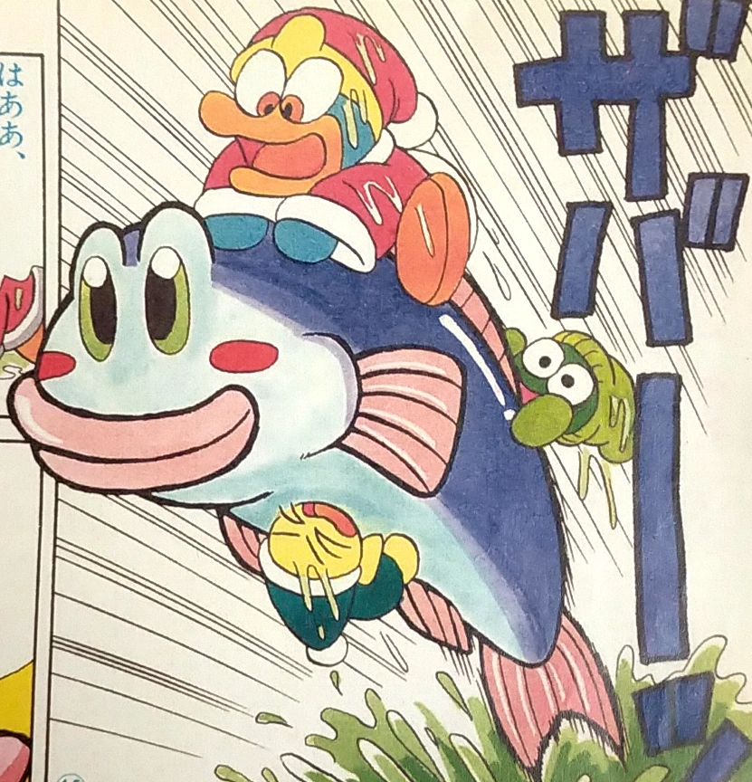 星のカービィ (前田のえみ) 1994年度1月号? | 魚をすいこんでコピーした姿。水に落ちたデデデ大王、ポピー、ノディを乗せて救助した。 |