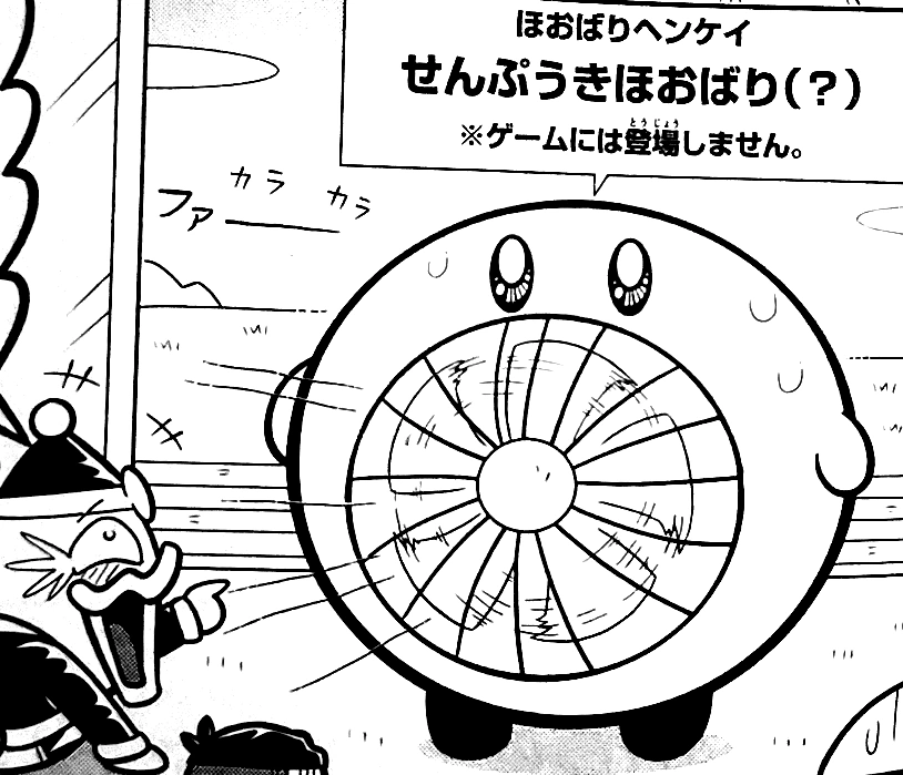 星のカービィ 〜まんぷくプププファンタジー〜 12巻 第135話 | デデデ城の扇風機を欲しがり、すいこみで寄せようとしたらヘッドが外れほおばりヘンケイした姿。本人は涼しくならない。アイスと併用することも可能。 「※ゲームには登場しません。」と注釈を入れられている。 |