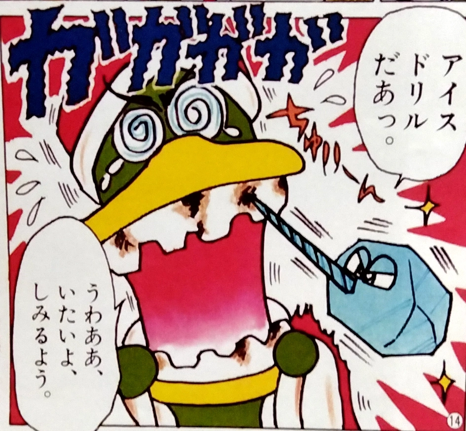 かっとび星のカービィ 第8話 | 氷から得たアイス能力と歯医者のドリルによるダブルコピー。デデデ大王の虫歯を狙って攻撃した。ドリル能力はゲームでも後に『ディスカバ』で登場。 |