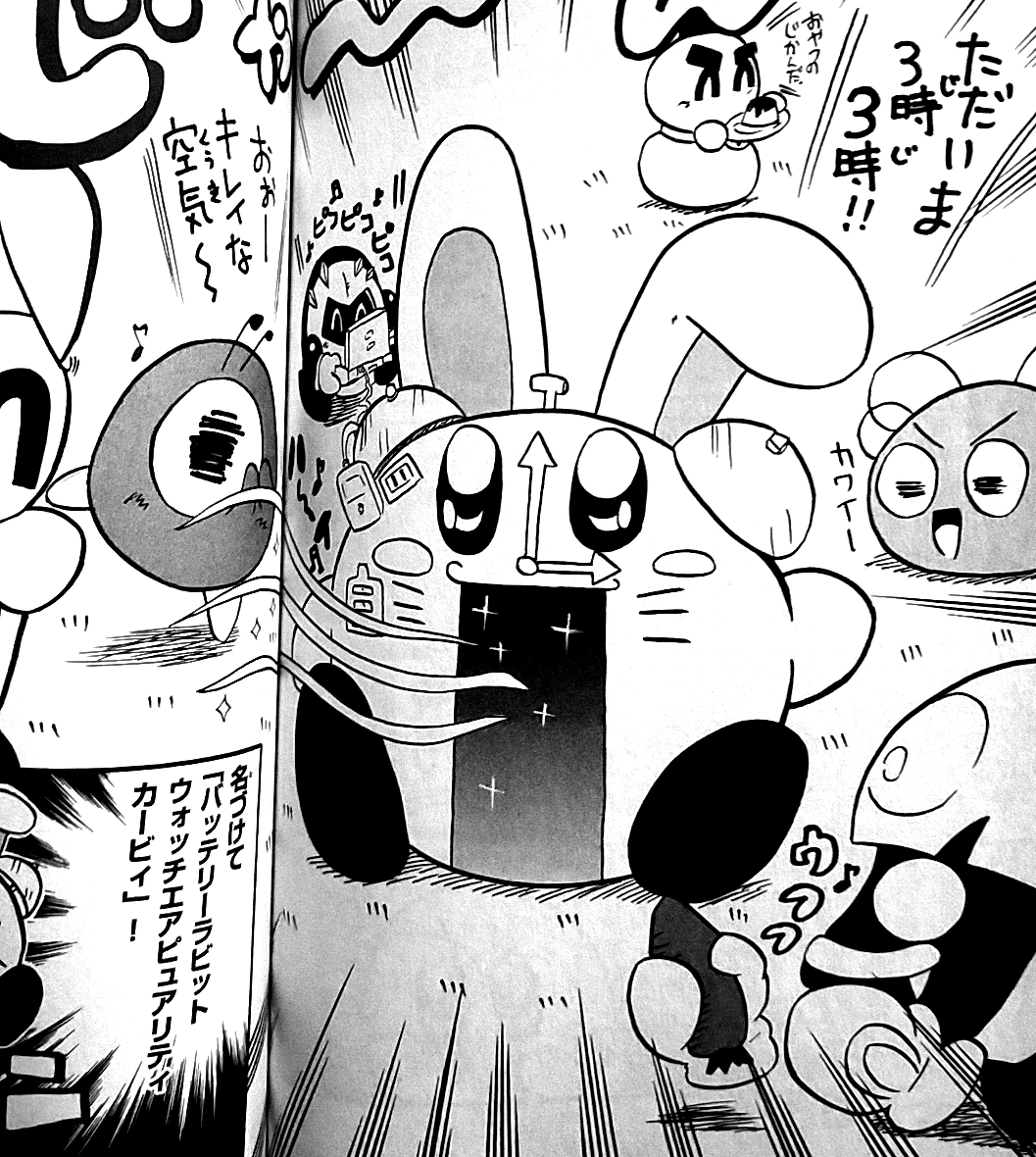 星のカービィ パクッと大爆ショー!! 2巻 第7話 | カービィがみんなの願いを聞いて何でもするということで、ワドルドゥの望む空気清浄機、タランザの望むウサギ姿、チリーの望む時計、メタナイトの望む3DSの充電器をいっぺんに応えた。何かをすいこんだ描写はないが、それらの機能は有している。 |