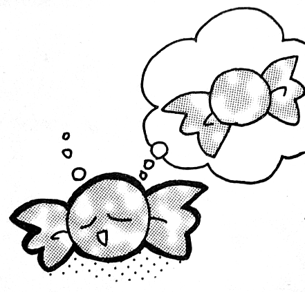 星のカービィ 4コマまんが王国 1 お星様救出大作戦 | まつやま登作。相棒のガラの悪いカービィが一回休みで寝てしまった際、ケーキの夢をもう1人のカービィがストーンの夢やニードルの夢、アメ玉の夢に入れ替えるとその姿に変化してしまった。アメ玉になったガラの悪いカービィはもう1人のカービィに食べられそうになった。 |