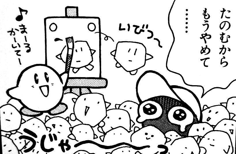 星のカービィ 4コマまんが王国 1 でででの大将 | 島本晴海作。ペイントローラーがスターロッドを描き実体化させてカービィに渡すも、スターロッドがペラペラだったため怒ったカービィがペイントローラーをコピー。キャンバスには「それではみなさんさよおなら」と書き置きが残されている。 |