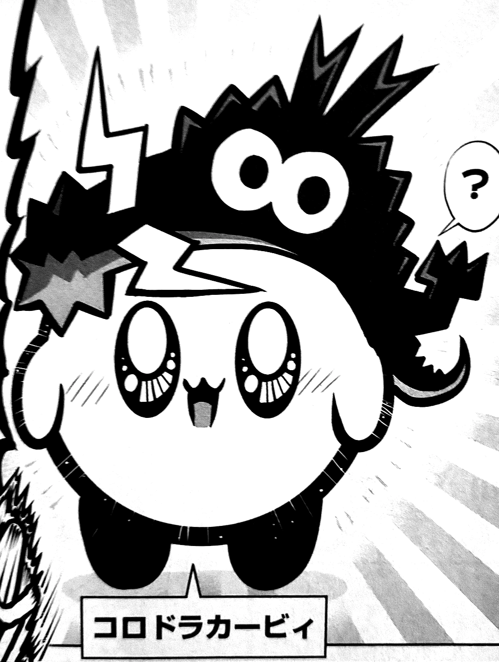 星のカービィ 〜まんぷくプププファンタジー〜 6巻 第61話 | 作中では「ねがいを叶える伝説のドラゴン」として登場したコロコロコミックのマスコット「コロドラゴン」を海苔と勘違いしてすいこんでコピーした姿。コロドラゴンはカービィの心の中から語りかけ、心を合わせることで「コロドラファイアブラスター」を放ち窮地から脱出した。使用後は能力がなくなったがコロドラゴンは復活し、カービィに1つだけねがいを叶えられるキーホルダーを授けた。 |
