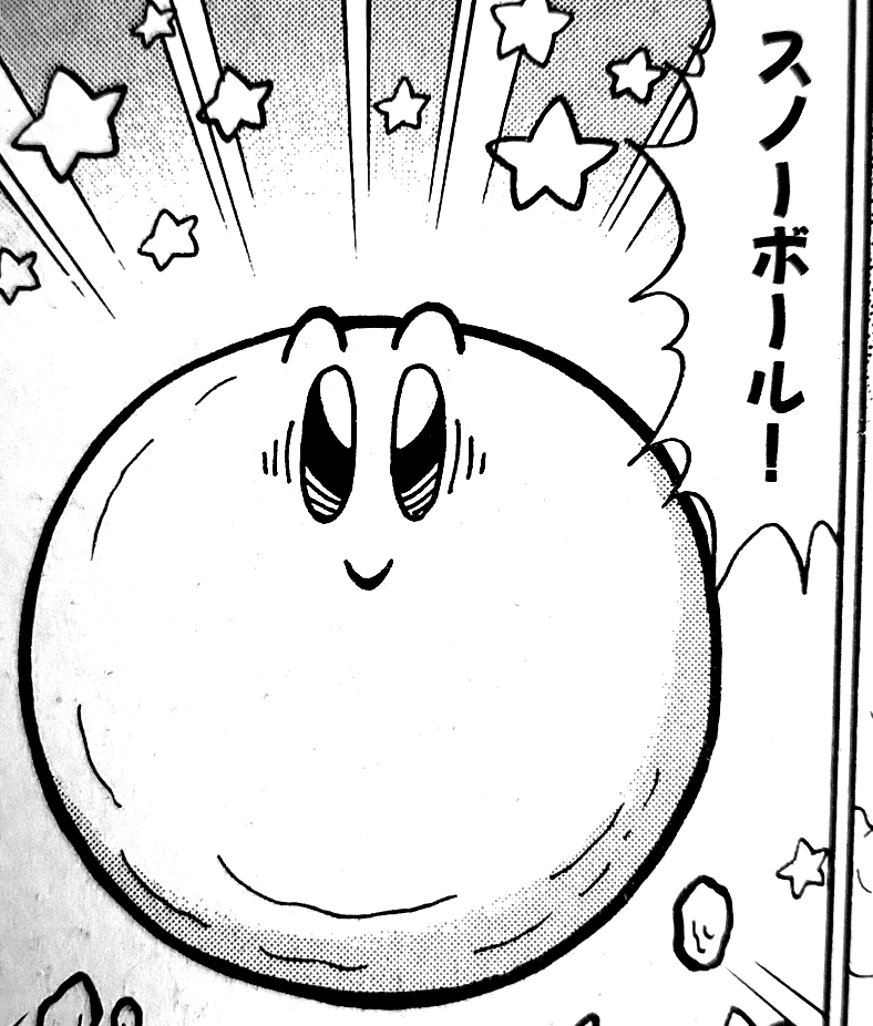 星のカービィ デデデでプププなものがたり 1巻 第8話 | 雪を食べてコピーした姿。逃げるデデデ大王を転がって追いかけ、雪を巻き込んで巨大化して押しつぶした。 自身が雪玉になる能力はゲームでも後に『カービィ64』でアイスアイス、『カービィWii』でスノーボウルとして登場。 |