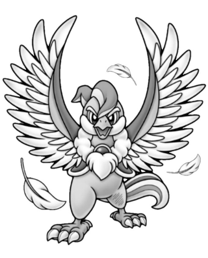 Active Blade is a large bird with two large wings and a mane of feathers around his neck. He has a jewel on his chest and two large talons. He has long tail feathers and wears what appears to be armor or a vest around the upper half of his body. He dons a sharp beak and a long tuft of feathers on his head.