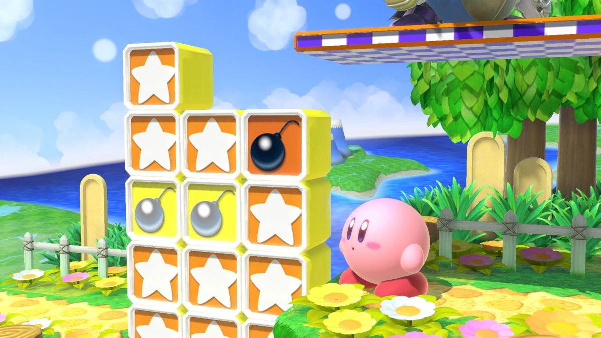 Bomb Blocks appear on the Green Greens stage. Bomb Blocks can be destroyed by most attacks, and will cause nearby Star Blocks to be destroyed. Unlike in the games, the explosion from the Bomb Blocks is damaging to fighters. Like in Kirby Super Star Ultra, they reappear due to stars falling down to replace them.