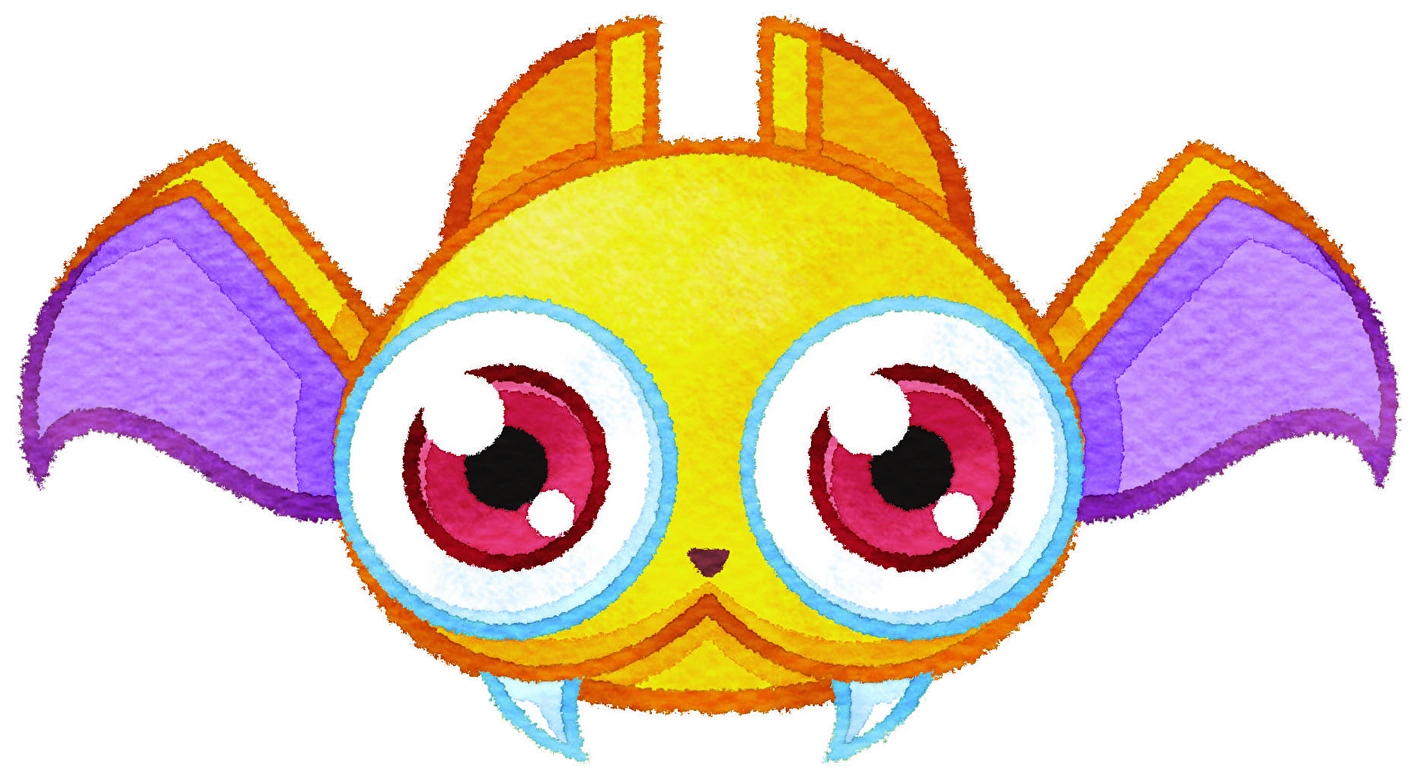 Buzzybat is a small yellow bat with small ears and large, round red shiny eyes. He has small purple wings and two large fangs sticking out his mouth. His facial structure resembles that of a cat. In his grave form, Mono Grave カ, he resembles a flying tombstone with one giant yellow shiny eye with a blue iris, and small wings. He also eventually turns red and his eyes become angry in both forms. When Buzzybat is defeated before becoming a skeleton, his body turns completely white and his wings and ears turn pink.