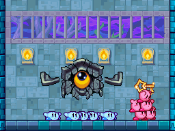 If the heroes have not attached themselves to Buzzybat after a few seconds, he absorbs the remaining Li'lbats and transforms into Mono Grave. While in this form, he floats overhead, charges up, and slams the ground. Any Kirbys squashed are KO'd, so they should dodge by running when he charges. Mono Grave shatters after two attacks, leading Buzzybat to revert back to his organic self and revive whichever Li'lbats were undefeated in the previous wave. The Li'lbats afford the player more time, as they now fly back and forth, extending the time before Mono Grave reforms. The player can end this phase by hitting the mid-boss with a Kirby—like Li'lbat, a single Kirby can pull Buzzybat to the ground. With a feline-esque groan, the bat takes damage.