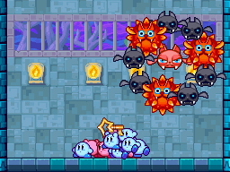 In his first phase, Buzzybat appears at the top of the room while two rows of nine Li'lbats protect him. The top row begins on the right side and drifts left, while the bottom row is the opposite. The player must flick the Kirbys into them to gradually dispose of the mid-boss' family; one Kirby is strong enough to drag a single Li'lbat to the ground.