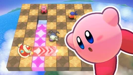 The game takes place on an 8x8 checkerboard above a rocky island with a volcano that features a star-shaped caldera. On "Intense!" difficulty, the stage is in space above Planet Popstar. The player can be Kirby, Waddle Dee, Adeleine, or King Dedede; having the same character picked more than once results in a different color for players who picked later.