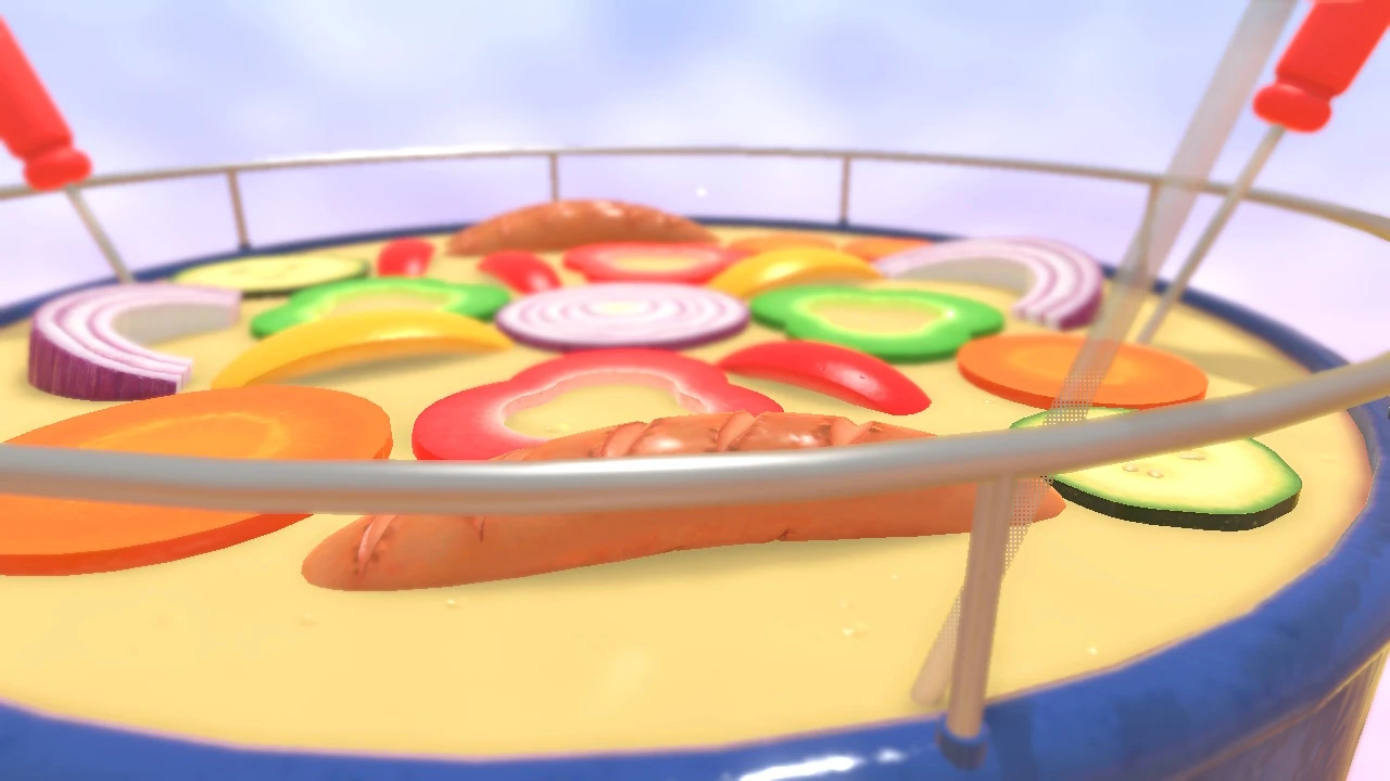 Cheese Fondue is a circular pot of cheese fondue, featuring floating sliced vegetables, sliced tomatoes, crackers and breads. Falling in the fondue slows movement, so remaining on the wiggling pieces of food that slowly rotate in the pot is essential. During the course of the falling strawberries event, spiked chocolate balls serve as hazards which fall and explode. The bombs briefly stun any Kirby they hit. Two kinds of minigame events can be played on this stage: "Eat the falling strawberries!" and "Defeat enemies and eat strawberries!". When 20-30 seconds are up, depending on the selected mode, the minigame ends.