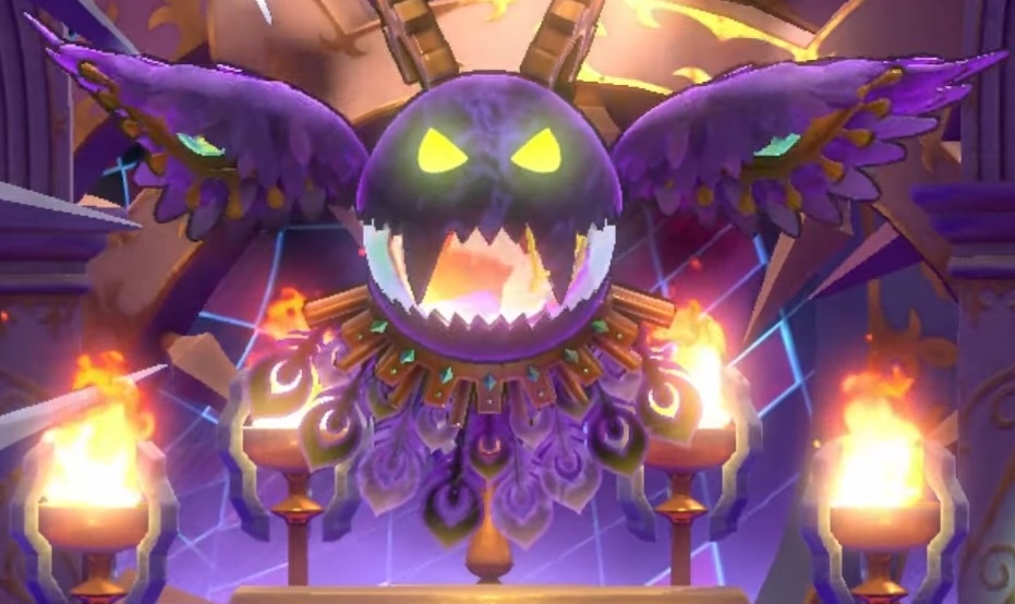 After Magolor fully completes the Gem Apple Seed to restore his powers, the shards of the Master Crown come in out of nowhere and absorb the fruit. This forms the Crowned Doomer, a revived and much more powerful version of the Grand Doomer who is seemingly out to stop Magolor as vengeance for making Kirby and his friends gather the pieces of the Lor Starcutter in the main game. During its boss fight, Crowned Doomer has a variety of attacks that it uses to damage Magolor. These attacks include launching large spheres of electricity or electrified water, summoning a barrage of laser beams, dropping bombs, teleporting quickly and hiding in the shadows in an attempt to grab the player, and tackling while covered in flames.
