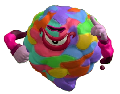 Gooey is a docile Dark Matter that is friends with Kirby, being introduced in Kirby's Dream Land 2. Gooey is very much unlike other members of the species, despite being made of the same material as them. He has two eyes instead of one, a mouth with a long tongue, and can use Copy Abilities like Kirby. Gooey does have a similarity in that he can take flight via his Mock Matter form, where he resembles Real Dark Matter and can use their lightning attacks. He retains his normal face when he does so, although as of Kirby Air Riders, a large, singular eye characteristic of other members of the Dark Matter race opens on his back in this form.