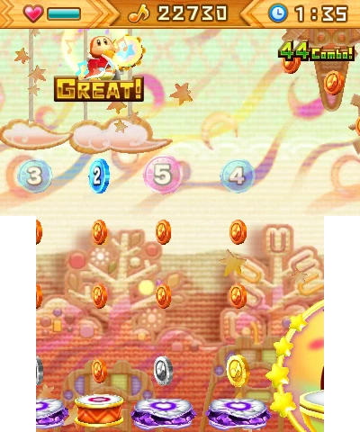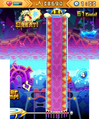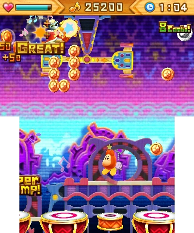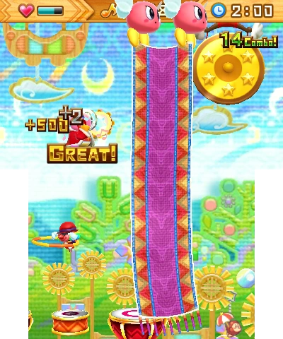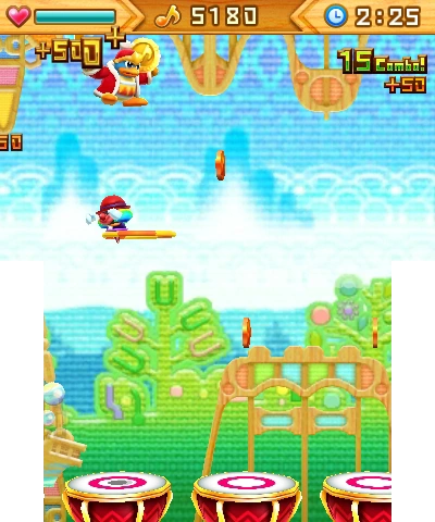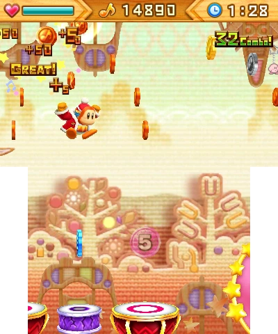 A sugary-sweet melody, courtesy of Kirby: Triple Deluxe. Get up high using the Super Jump, and hit the backbeat cymbals with A! | New to this version of level 2: the blindfold banner and lots of drums that keep coming and going... |