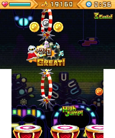 The player can move Dedede left and right as he bounces and increase the height of his jumps by pressing A upon landing on a drum. Pressing A again after a high jump will result in a super jump. However, if Dedede lands on the edge of a drum, he will not bounce high. By pressing A at the peak of his jump, Dedede will perform a backbeat. Depending on the timing, each backbeat receives a rating. If it is rated Good, Dedede will clap. If it is rated Great, he will beat on a tambourine. If Dedede hits a backbeat when he is positioned in front of a gong, he will hit the gong, causing Musical Coins to appear.