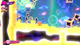 Soon after is another Bomb Block. Continuing allows the player to see the fifth Friend Heart, which requires using Zap Staff to electrify the water to hit a Bomb Block, as there are currents and Gordos preventing from approaching it normally. Destroying the Bomb Block will cause the Friend Heart to drop into the water, which Kirby will have to quickly swim to in order to prevent it from falling into the abyss, while also dodging or defeating enemies; the only way to retry this puzzle is to sacrifice a life.