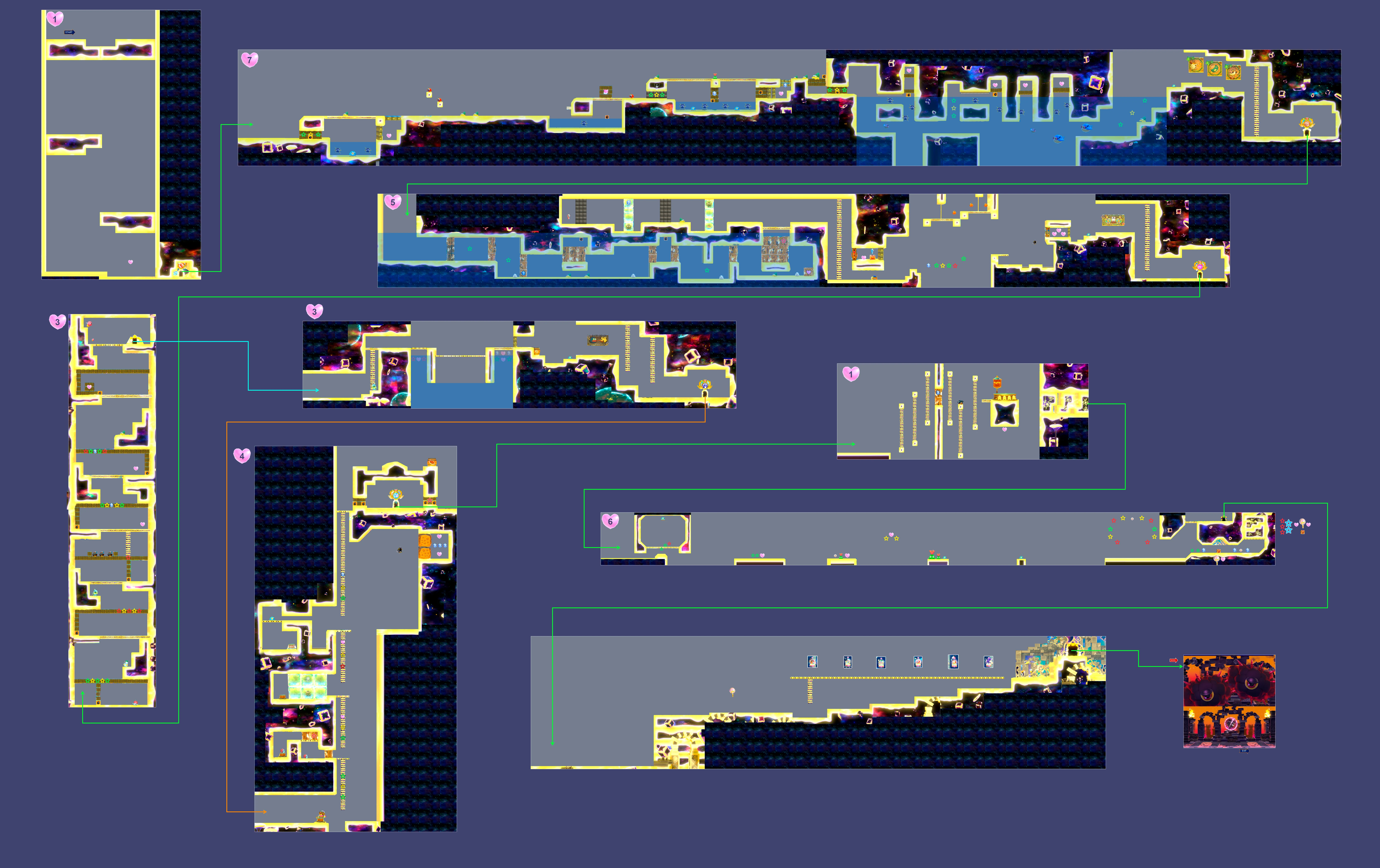 In the first room, Kirby comes across platforms that serve as elevators, falling once he walks on them. After riding down four of them, Kirby comes across the first Friend Heart of Dimension II. Collecting it is mandatory in order to progress. After collecting it, the wall to the right will rise, revealing a Hero Door that transforms Kirby into Staff.