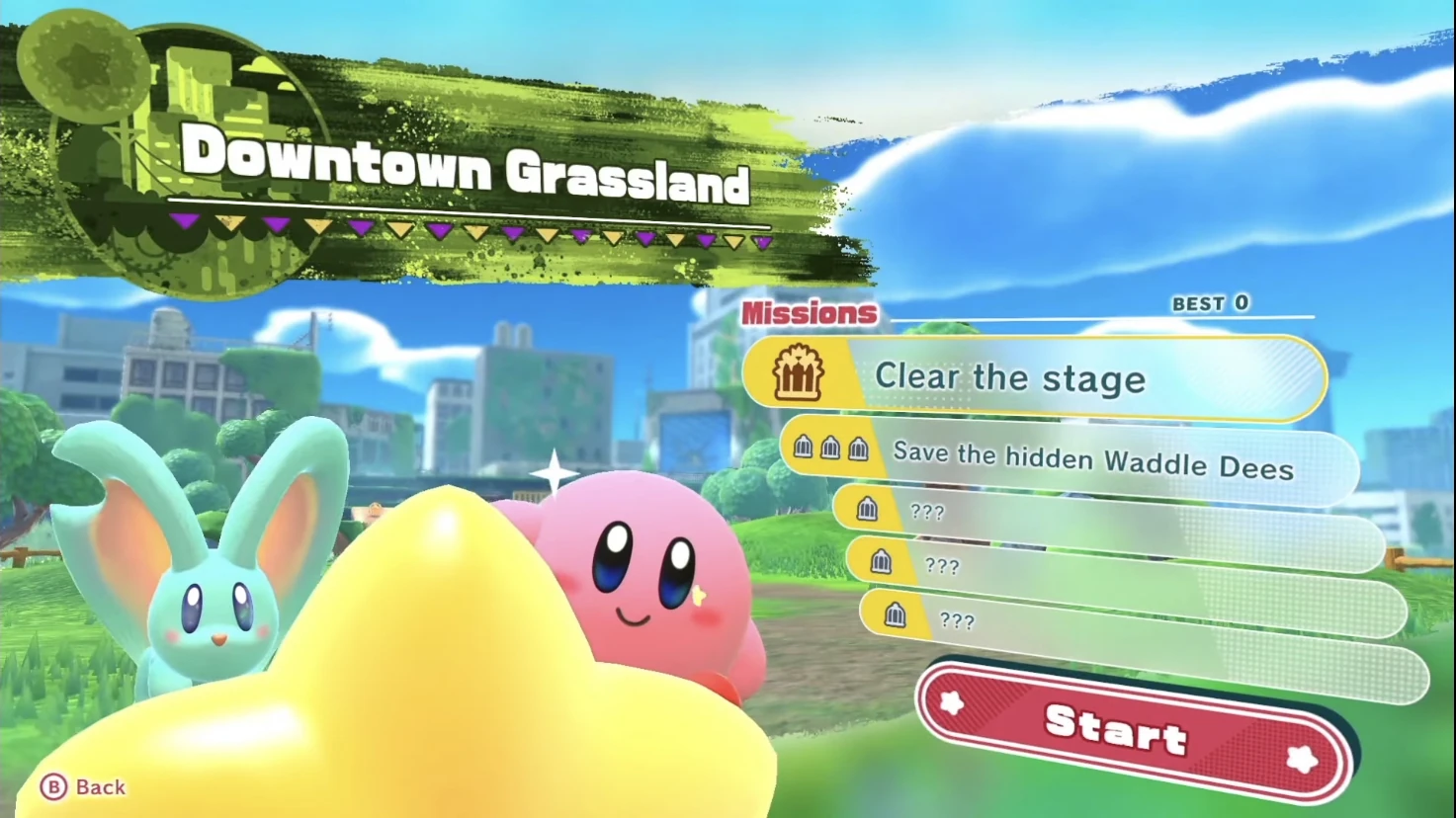 Downtown Grassland is the second stage in Kirby and the Forgotten Land. It is the second stage of Natural Plains. It succeeds Point of Arrival and precedes Through the Tunnel.