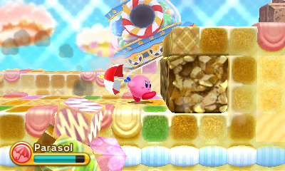 In Kirby: Triple Deluxe, wooden barrels (marked with jigsaw patterns) and wooden crates appear. Kirby can destroy these containers to access their contents. They hold anything from stars to enemies. Kirby: Planet Robobot introduces steel kegs.