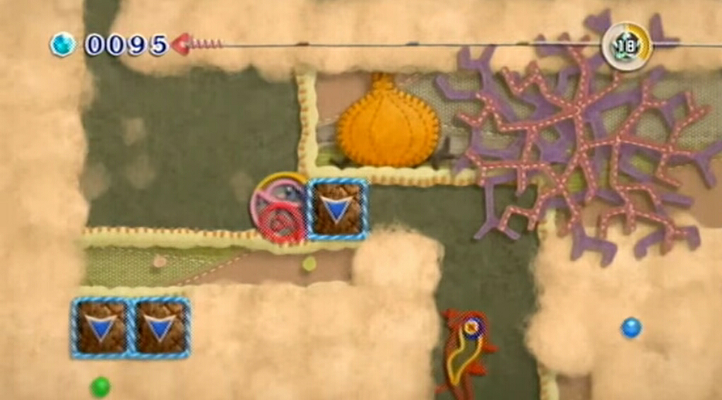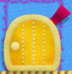 Not to be confused with Patches in Kirby Air Ride, patches in Kirby's Epic Yarn are anything attached with a small red tab at the upper right corner, which allows it to be pulled off using Kirby's yarn whip. They come in several different shapes and sizes, but this does not always indicate what is behind it. Metamortex patches always cover Metamortexes; door-shaped patches always cover doors. These two always look the same. Square and circular patches can obscure just about everything but doors and Metamortexes, and their decoration varies from level to level.
