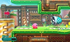 Tubes are objects introduced in Kirby Triple Deluxe in specific rooms, but are much more prominently featured in Kirby: Planet Robobot. When Kirby stands directly next to one of these green tubes and the player presses whichever direction the tube is facing, the hero quickly slides through. He can use this to pass through walls. Most tubes are rounded but some are square-shaped.