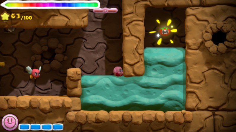 Waterfalls in Kirby and the Rainbow Curse act differently from waterfalls in other games. They are particularly strong; if Kirby rolls into one, he gets stuck under the intense downpour. In fact, waterfalls can push Kirby downward through thin platforms if the hero is positioned on one. The player can shield Kirby by drawing rainbow lines to block the water. Waterfalls are beneficial to Kirby Submarine, however, as he can cruise up them. Carpas are the only enemies in the game that are able to swim up waterfalls.