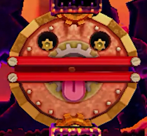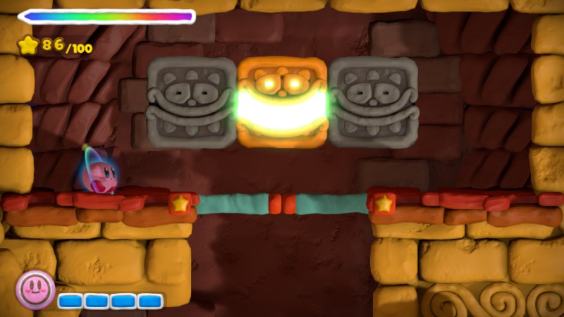 Smiling face impressions appear on some walls in Kirby and the Rainbow Curse. When Kirby rolls past one, it opens its eyes and mouth, which both cast a glow. When passed a second time, it will return to its previous position. To open gates, Kirby must illuminate all faces in a set.