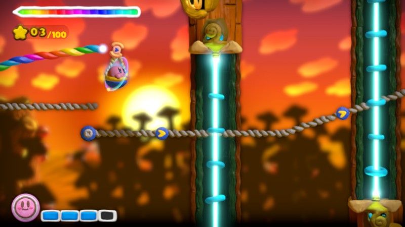 Lasers[7] are hazards in Kirby: Canvas Curse and Kirby and the Rainbow Curse. It acts as a barrier or hazard, but the beam can be blocked with rainbow lines/rainbow ropes.