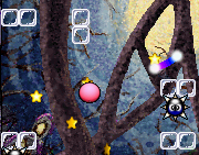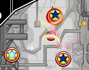 A Star Bar is a beneficial device. Each one starts off with a glowing central yellow star. When the player character rolls across it for the first time, the Bar releases several Stars, and its central star stops glowing. After doing this, it no longer does anything interesting. Interacting with a Star Bar does not affect the direction of movement or speed of the player character in any way. Star Bars and a larger variant appear in Kirby and the Rainbow Curse.