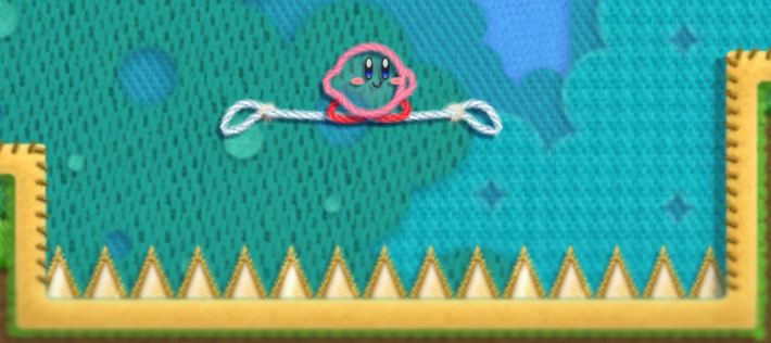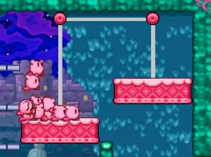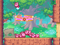 In Kirby Super Star, Kirby & The Amazing Mirror, and Kirby Super Star Ultra, ropes are part of puzzles involving platforms. When cut, they release the platforms, which allow Kirby to go through the pit which it once covered. Enemies can fall right through the platform, however. Rope puzzles are featured in several puzzles involving treasure in The Great Cave Offensive, and are common obstacles to Kirby from accessing 1UPs and various Food.