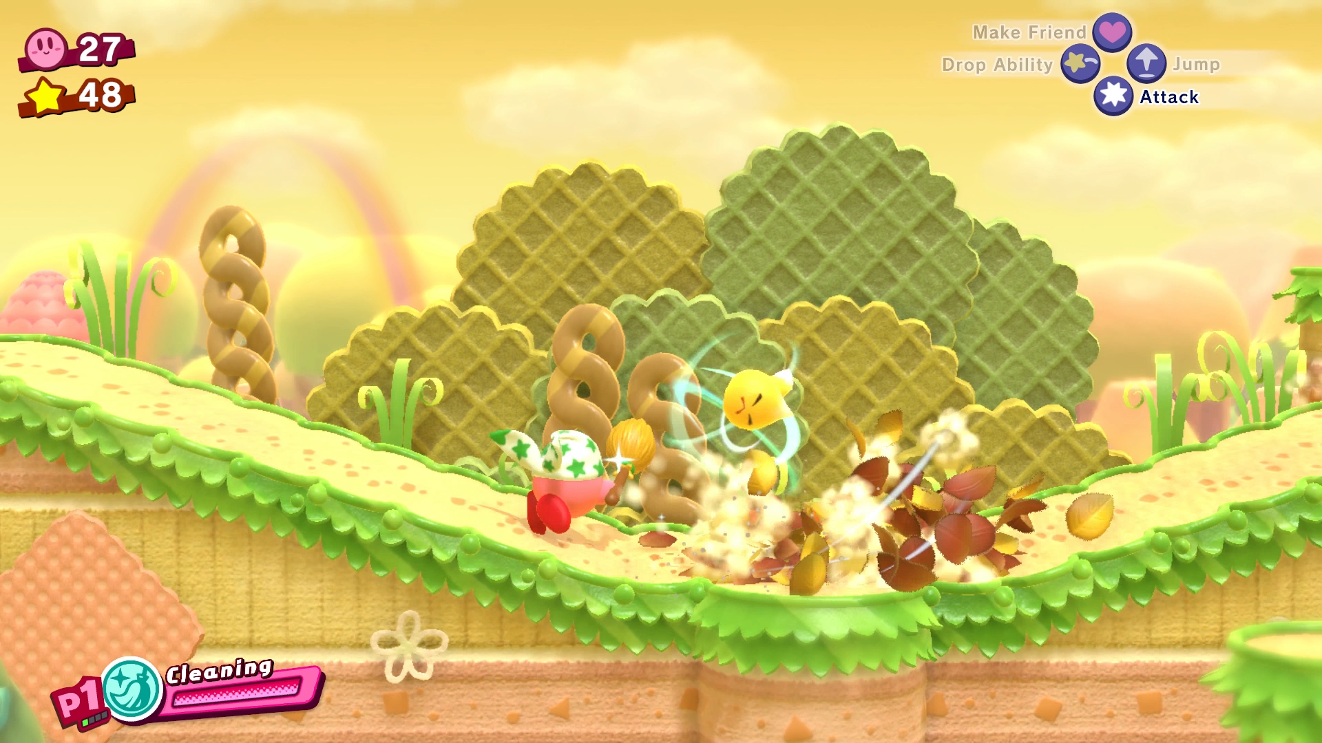 Cleaning Kirby sweeping up some leaves.