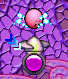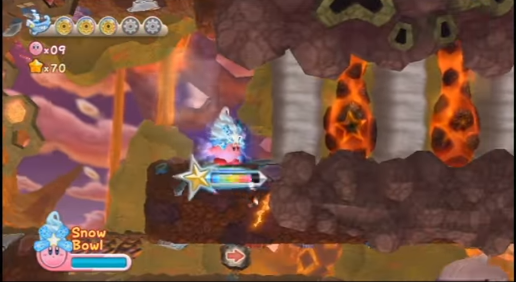 Snow Bowling Pins appear in most stages with the Snow Bowl Super Ability, if Kirby uses the Snow Bowl ability to bowl them down, a nearby party ball (which takes on a steel appearance in Dangerous Dinner) will open up and reward him with Stars and Food, Snow Bowling Pins are ice with spikes in White Wafers, and appear to be made out of molten lava and rock in Dangerous Dinner.
