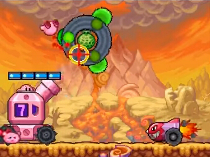Another common variant is the floating type, which does not require lighting fuses to be fired. These generally come in two colors: green and yellow. Yellow ones fire automatically while green ones require the player's input to fire. Some of these cannons rotate, and work like Zebon from the previous games. Some of the cannons in Kirby: Triple Deluxe turn or slide horizontally when the player tilts his/her Nintendo 3DS system.