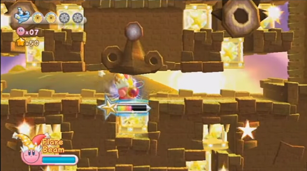 Flare Batteries are obstacles in Kirby's Return to Dream Land which resemble large, glass capsules with stars in them, by using the Flare Beam Super Ability, Kirby can give energy to these batteries, once all in a set have been energized, they will release stars that give power to something, usually shutters.